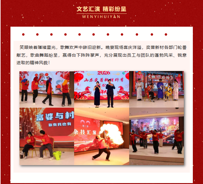祥蛇擺尾辭舊歲,駿馬昂首啟新程?;赝?025,奕普新材于時代浪潮中奮蹄篤行,在市場風云中合力攻堅,以堅實足跡刻下奮斗的年輪。展望2026,我們將繼續高 擎“團結凝聚力量、奮斗創造輝煌”的信念旗幟,以龍馬精神拓路前行,以騏驥之速聚力飛躍,向著“國 際一 流綠色阻燃材料企業”的戰略愿景全力馳騁,共赴嶄新輝煌!