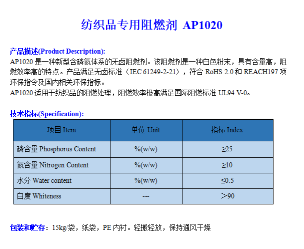 紡織品專用阻燃劑AP1020 2022-6-1 本文被閱讀 3185 次